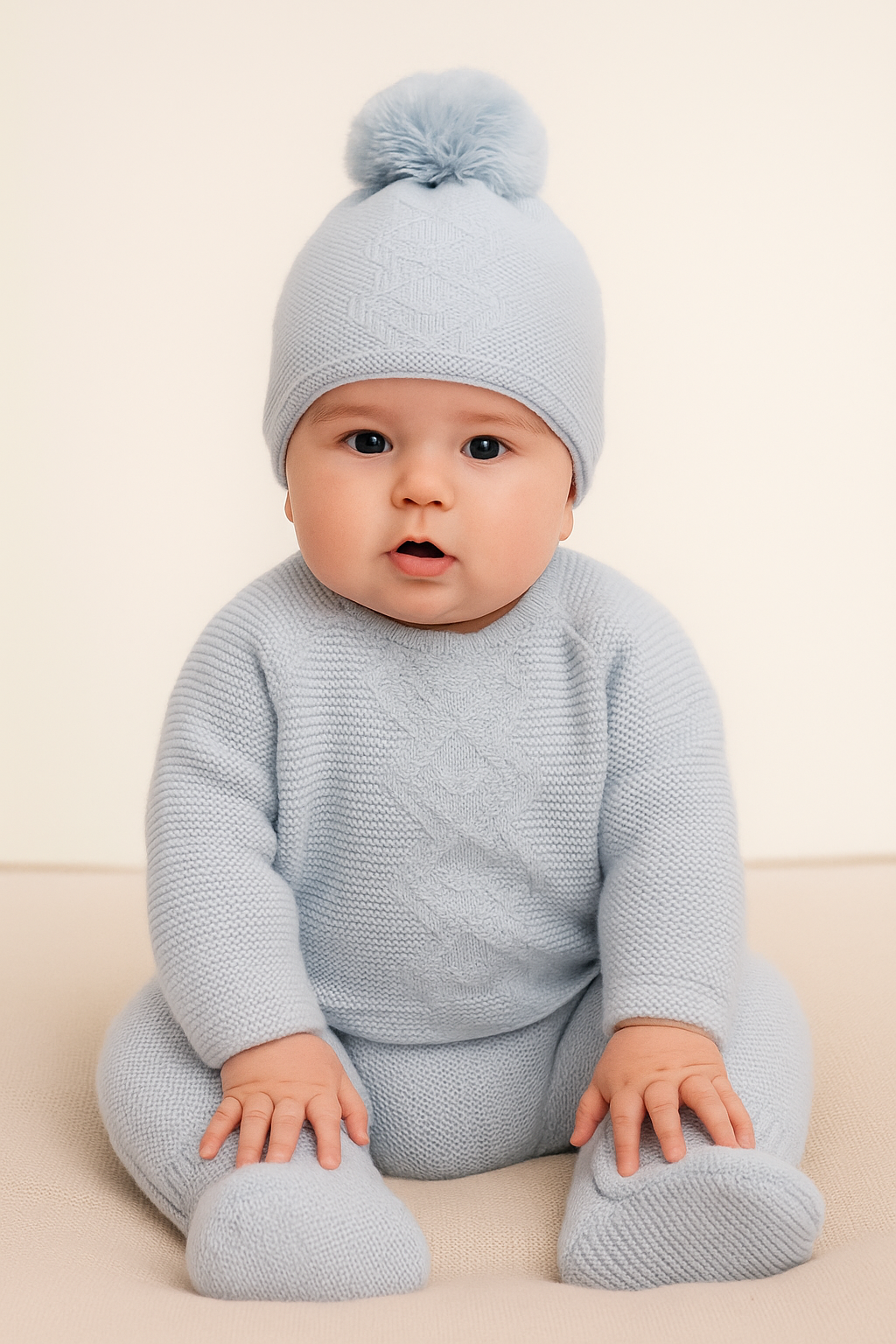 Este conjunto de punto celeste para bebé es dulce y acogedor, compuesto por jersey con detalle trenzado, polaina con pies cerrados y gorrito con pompón. Hecho en punto suave, ofrece máxima comodidad y abrigo para la delicada piel del bebé.
