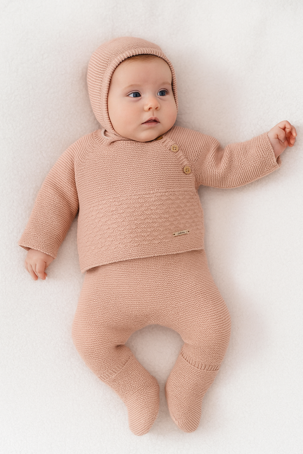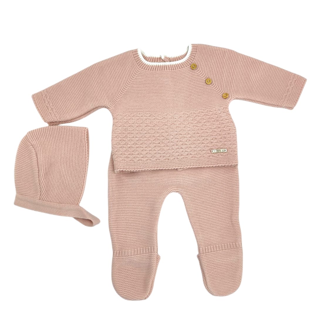 El conjunto de punto maquillaje para bebé destaca por su delicado color y diseño elegante. Incluye jersey con botones en el hombro, polaina con pies cerrados y gorrito a juego. Fabricado en punto suave y transpirable, ofrece la máxima comodidad para el bebé.