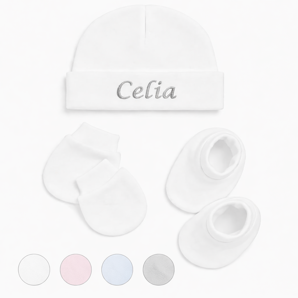 Pack de nacimiento personalizado – Gorro, manoplas y patucos con bordado