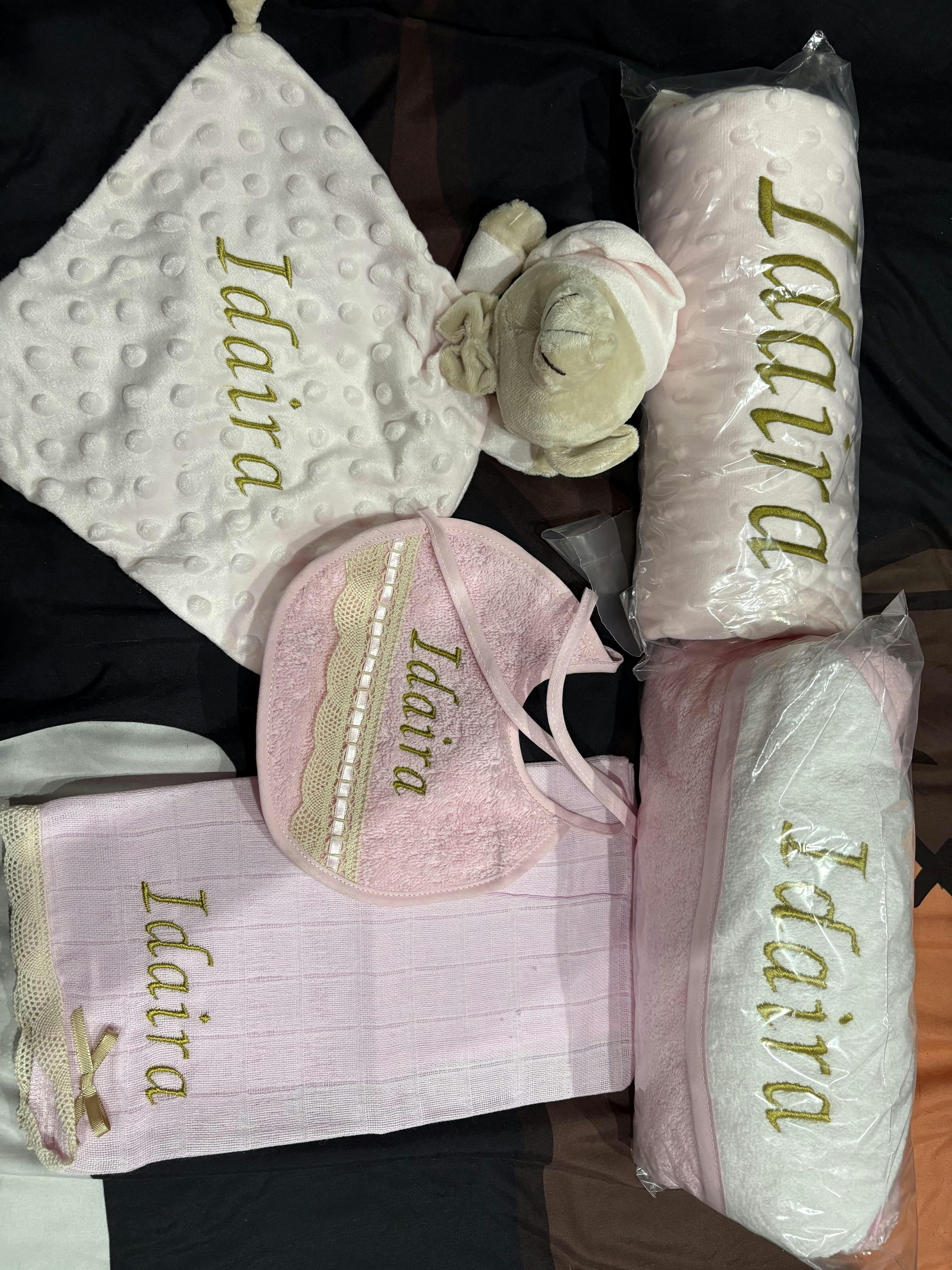 Pack de toallas y baberos rosa con bordado gris personalizado con nombre Naira.
