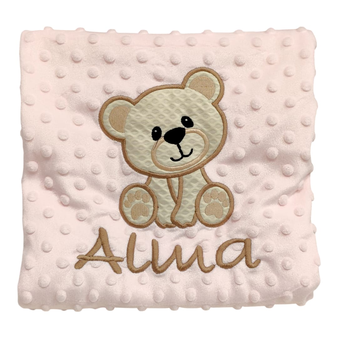 Descubre la ternura y suavidad de nuestra manta personalizada para bebé en color rosa con tejido minky de topitos. Incluye un adorable osito bordado y el nombre del bebé, convirtiéndola en un regalo único y especial.