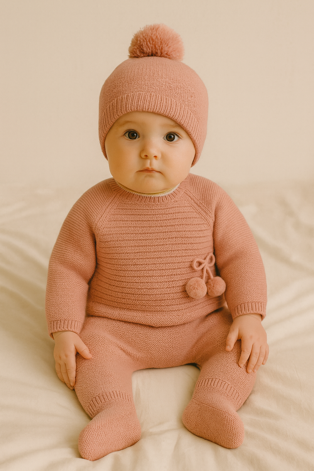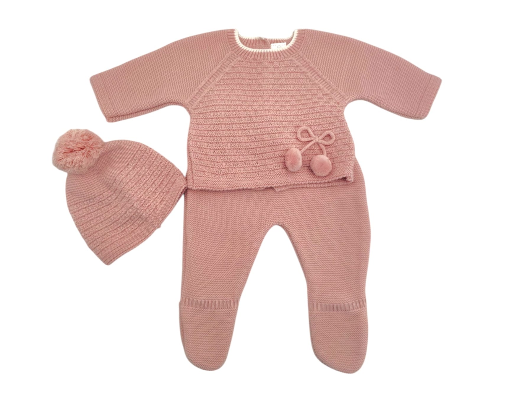 Conjunto de punto para bebé en color rosa, compuesto por jersey de manga larga con delicado diseño en relieve, polaina con pies cerrados y gorro a juego. Un conjunto clásico, elegante y muy cómodo, ideal para recién nacidos y bebés.
